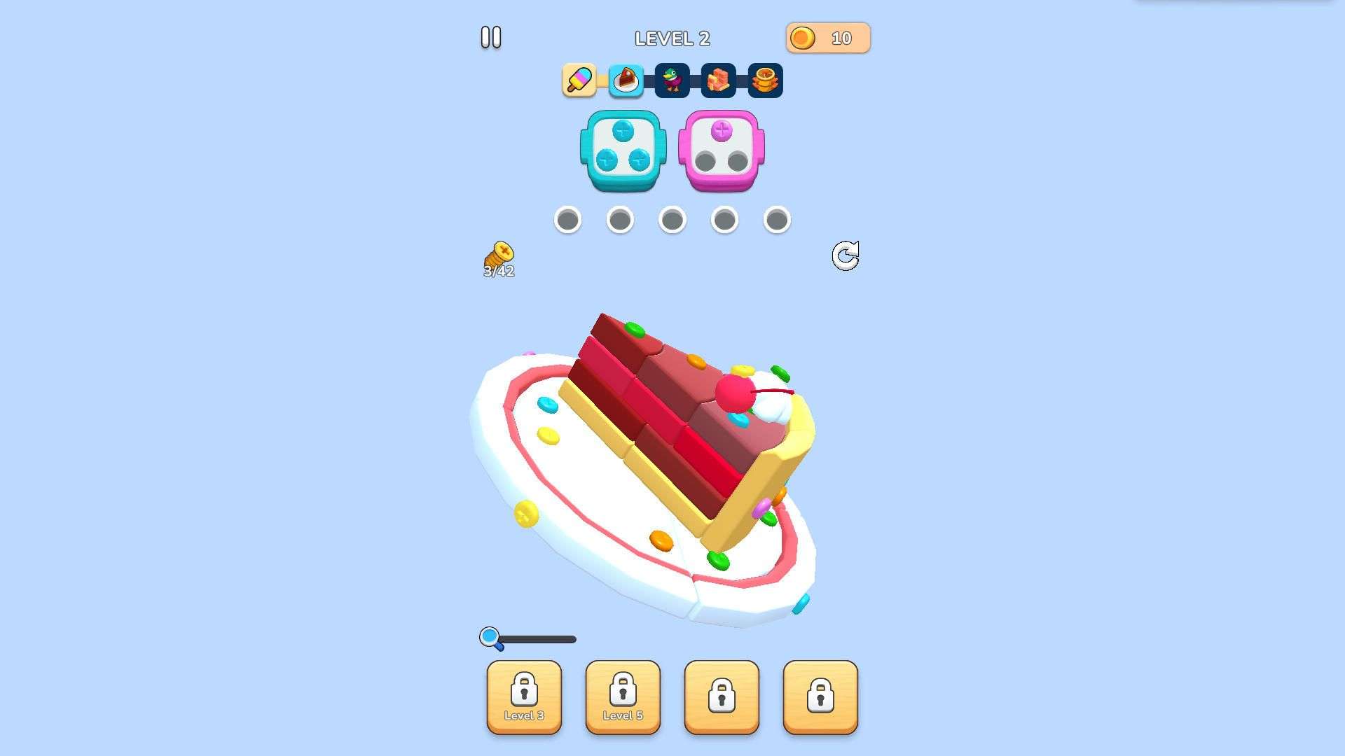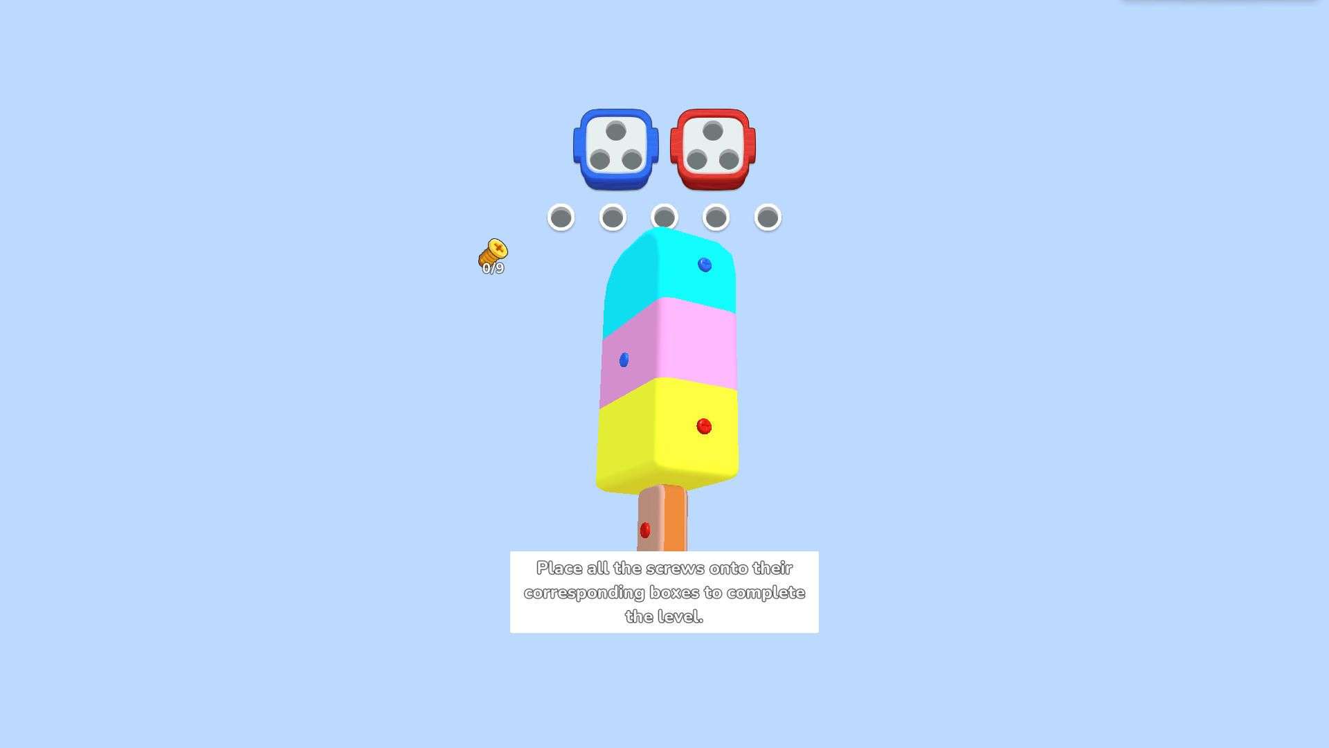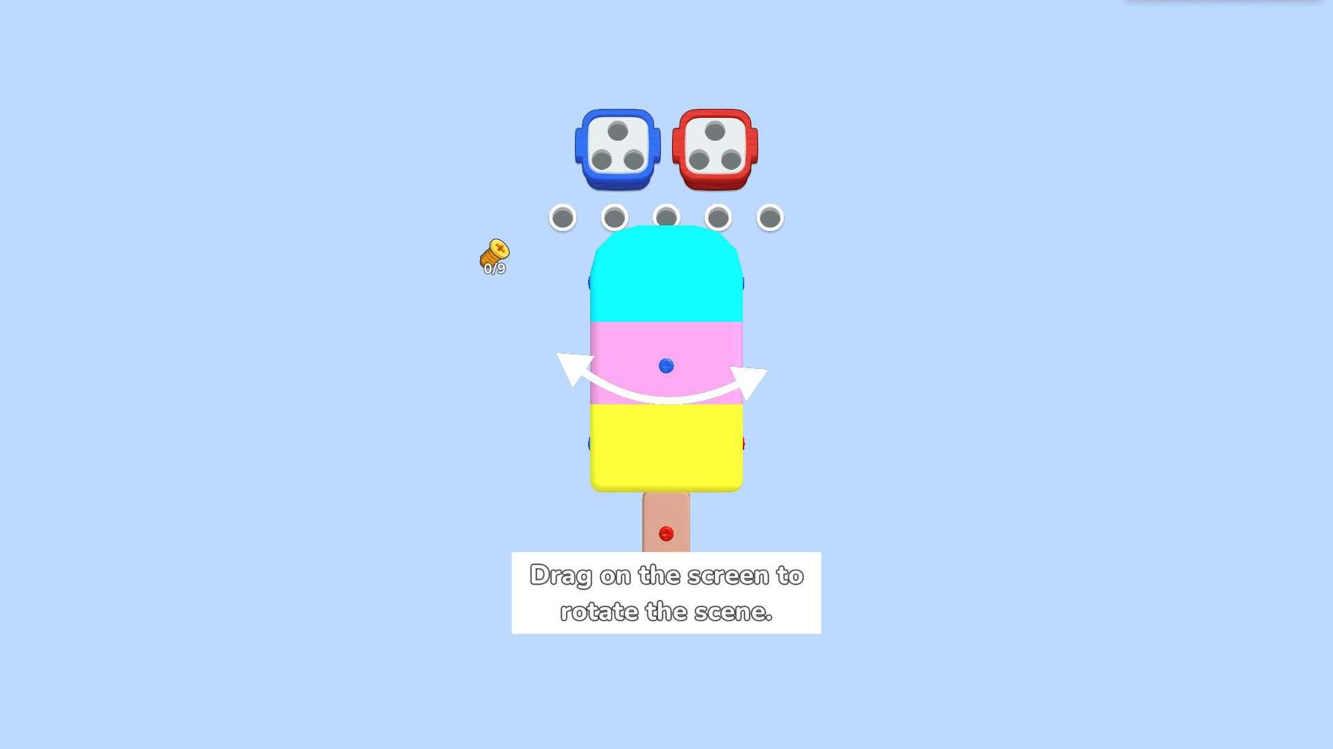 The core gameplay of the game is to rotate the scene (as prompted in the first level "Drag on the screen to rotate the scene") and put screws (pins) of different colors into the corresponding boxes of the same color above. Each level requires all screws to be put in place. For example, in the first level with an ice cream shape, blue, red and other colored screws need to be put into the blue and red boxes on top. After completion, you can enter the next level (such as the second level with a cake shape).