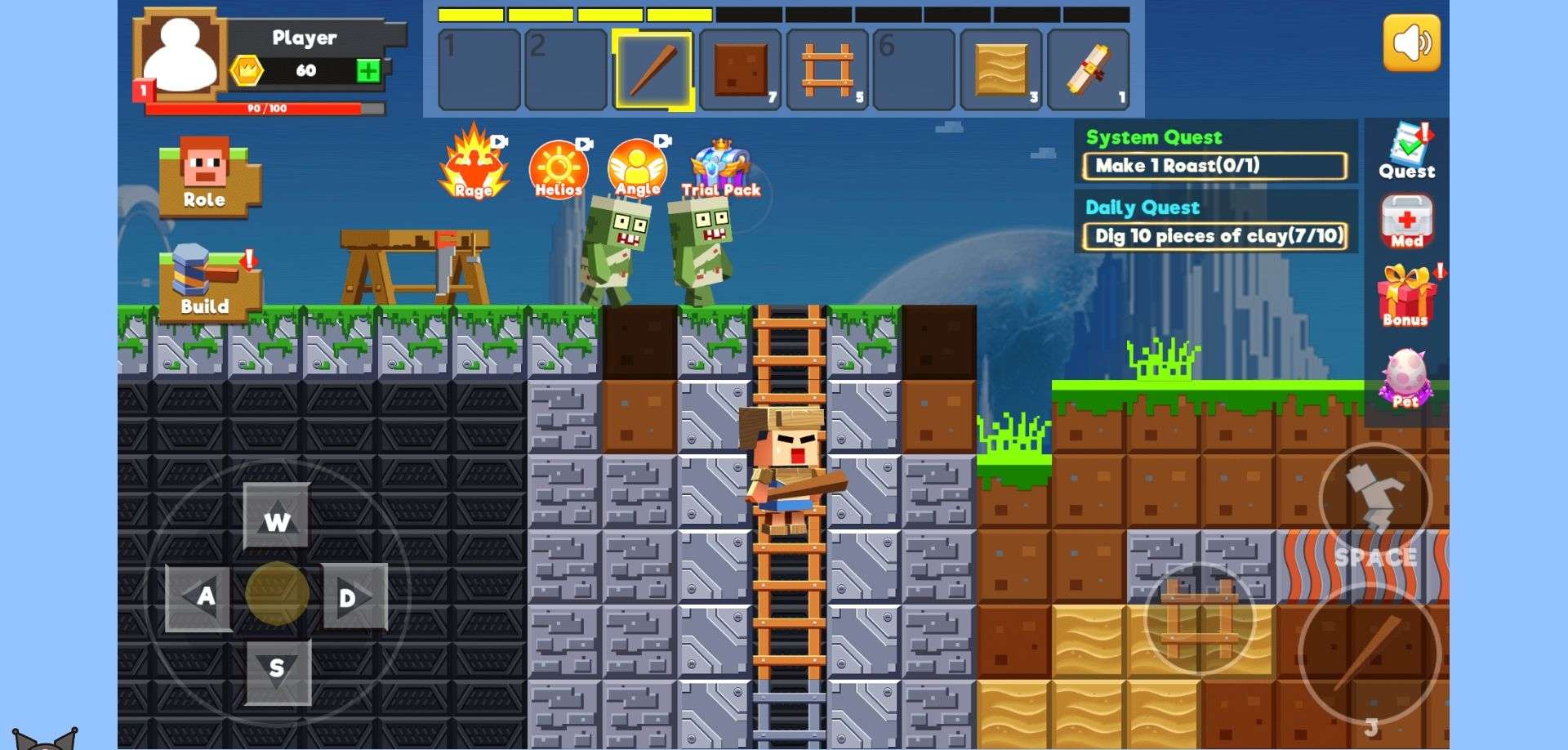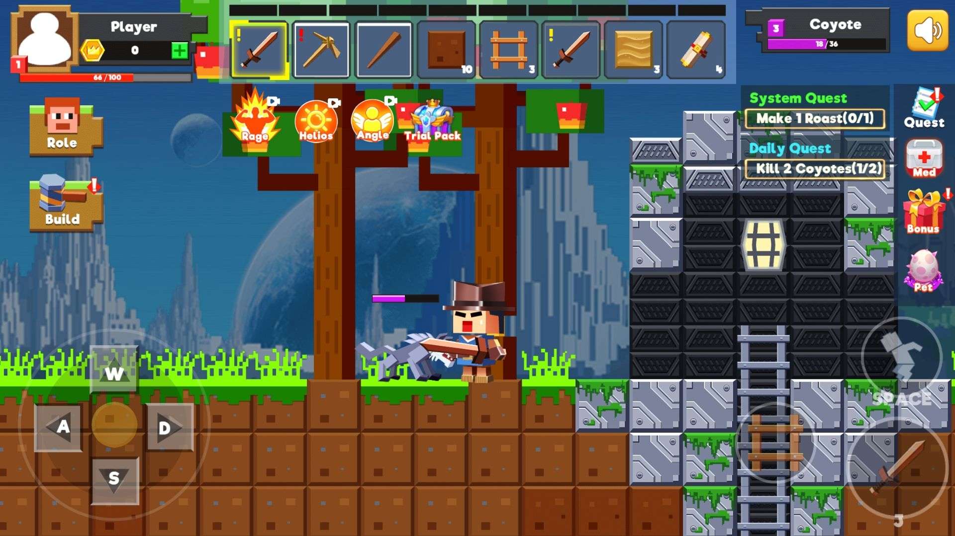 Select blocks from your backpack, then drag and drop them to build structures. When encountering enemies, tap the weapon icon to switch weapons. Slide the screen to aim and tap the attack button to fight. To set traps, select the trap item in your backpack and tap to place it.