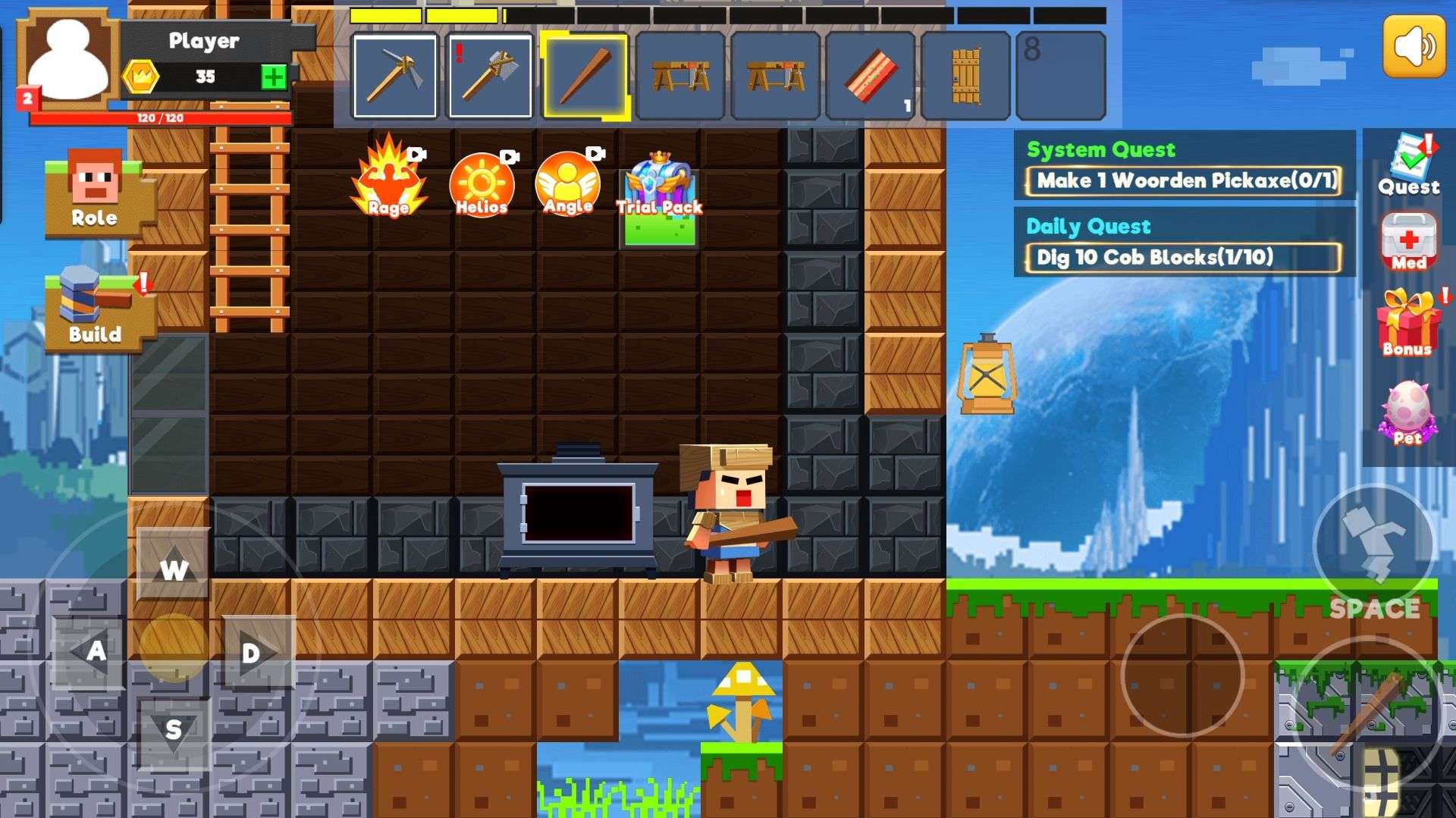 Slide the screen to move your character. Tap on blocks to collect resources, which will be automatically added to your backpack.