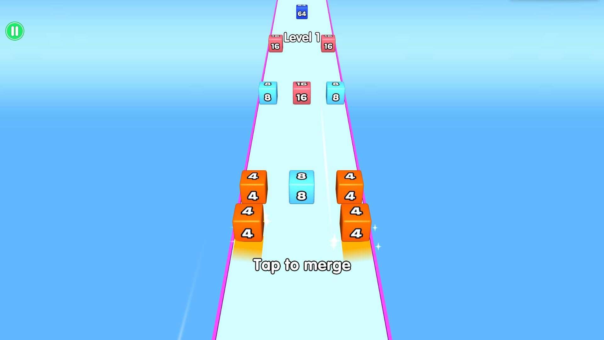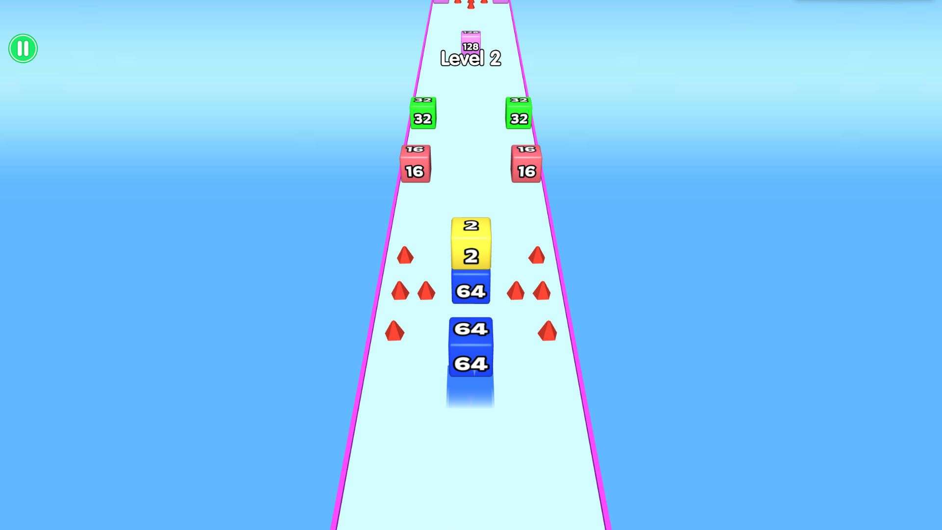 Move forward along the track. By continuously merging cubes of the same number, double the numbers, and reach the end of the level (for example, in Level 3, you need to guide the block to reach the end area marked “Level 3”).