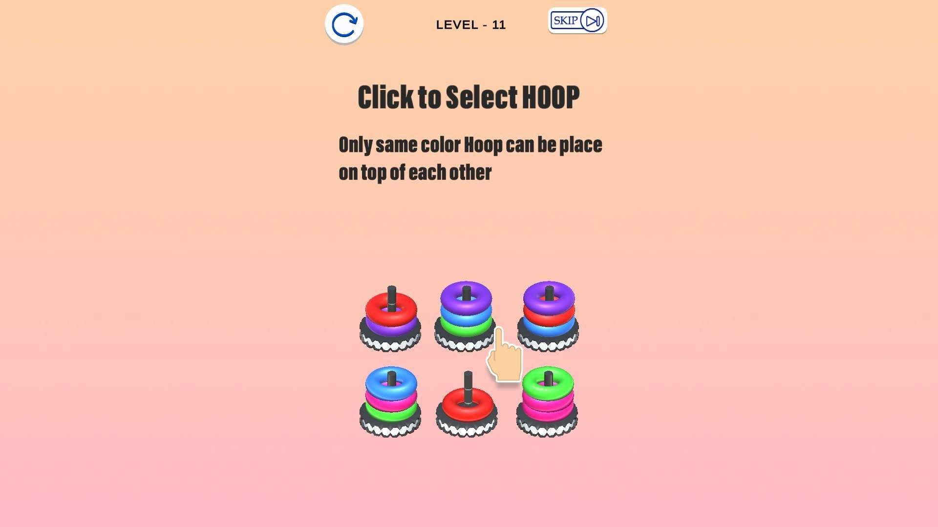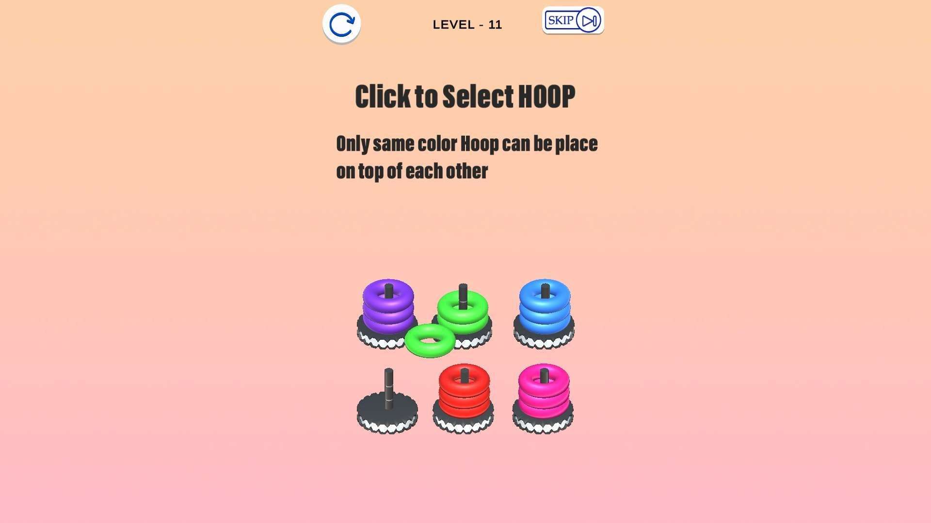 3. Place the Hoop: Release your finger/mouse to complete the placement. Repeat until each column has hoops of only one color to clear the level.
