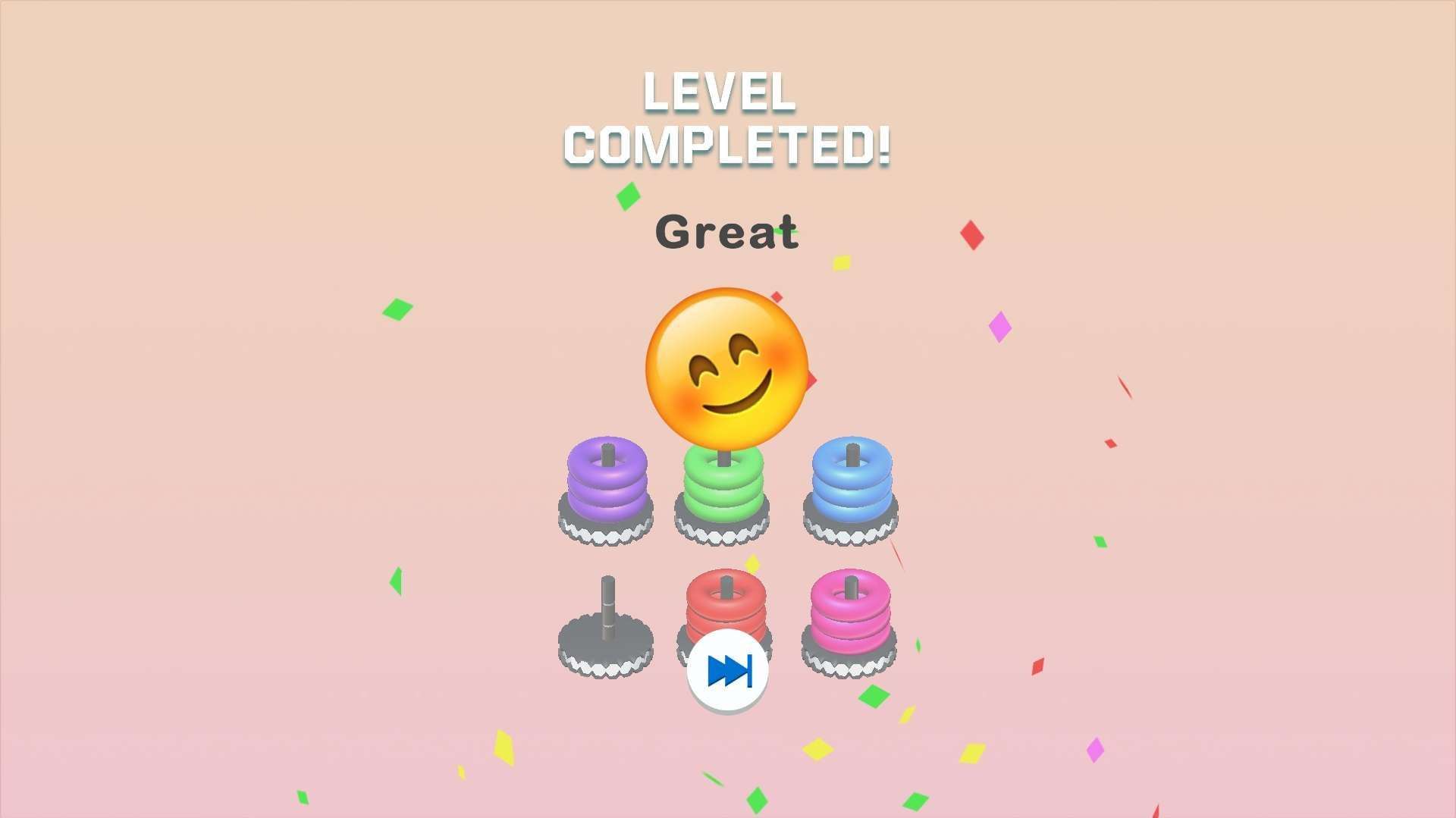 As you advance through levels, the number of hoops and color combinations gradually increase. From easy sorting in the early stages to strategic planning later on, you’ll gain a sense of satisfaction from "organizing chaos" after completing each level, making the game balance casual fun with moderate challenge.