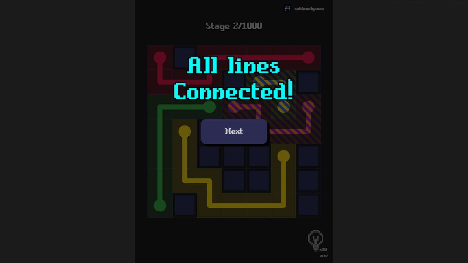 Plan routes to draw exclusive paths for each pair of dots of the same color. Use functions like hints (the light bulb at the bottom right, with a limited number of uses), double - click to automatically complete the end of a path, and right - click to clear incorrect paths for assistance. Complete level challenges, gradually conquer complex grids starting from simple layouts, and proceed to the next level after achieving “All lines Connected”.