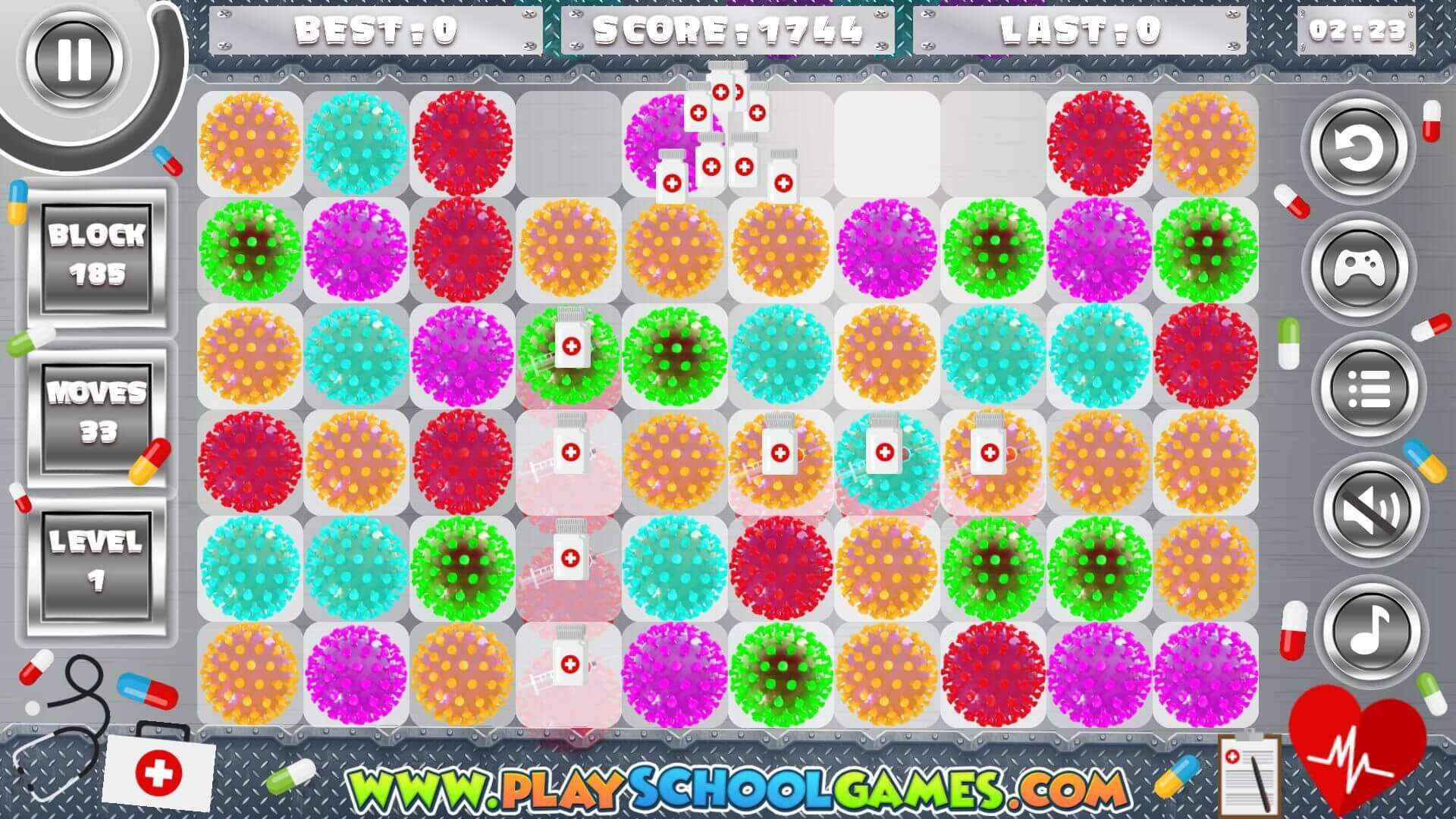 1. Swipe adjacent identical viruses; match 3 or more in a line to eliminate