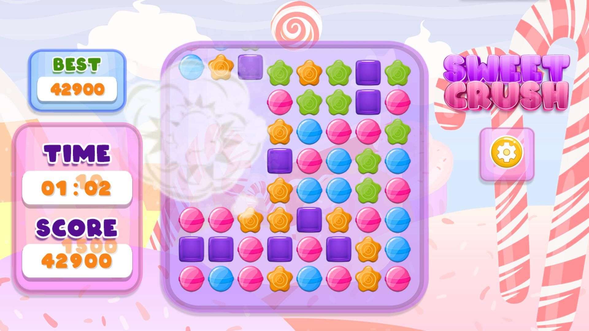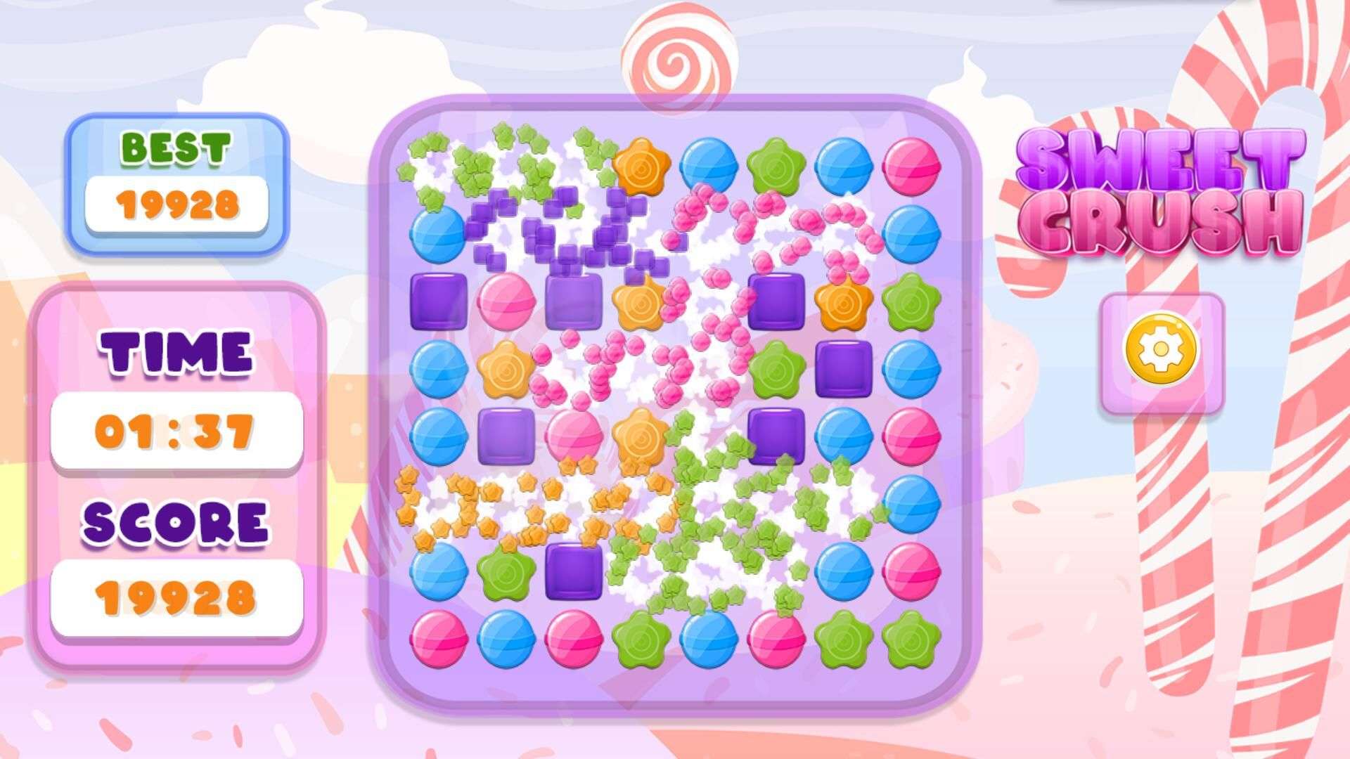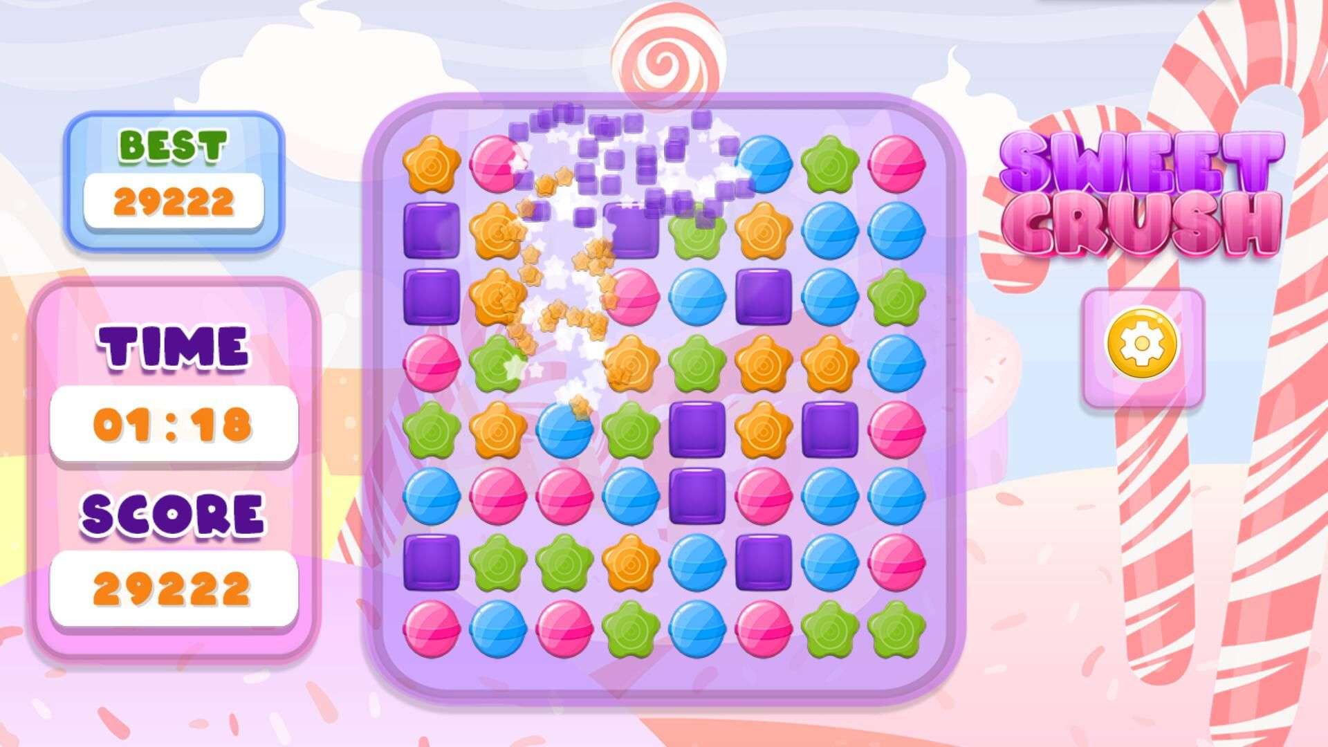 Step into the colorful, candy-filled world of Sweet Crush — a charming match-3 puzzle journey you won’t want to put down! Here, the rules are simple: swap adjacent candies to line up three or more of the same type, watch them burst in a shower of sparkles, and rack up those points. As you breeze through levels, you’ll unlock awesome power-ups: some will sweep away whole rows of candies in one go, others will zap every candy of a single color off the board, and the most epic ones will trigger explosive blasts for game-changing combos! Challenge your pals to beat your high scores, climb the global leaderboards, and find out who’s the ultimate candy-crushing champion in this delightful, addictive puzzle game. Ready to make some sweet matches?