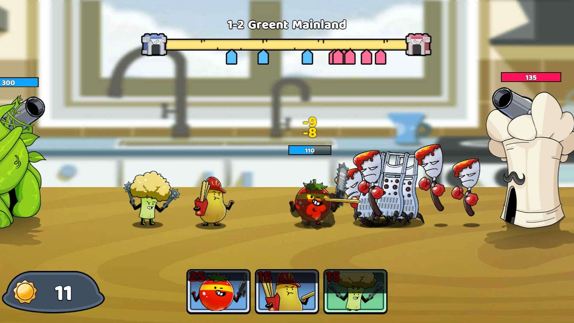 Defeating enemies rewards you with coins. Use these coins to promptly upgrade defensive towers at key positions, enhancing their attack power, attack speed, and attack range. If a defensive tower proves ineffective against the current enemies, you can demolish and replace it with a more suitable food tower. However, be cautious as demolition results in the loss of some resources.