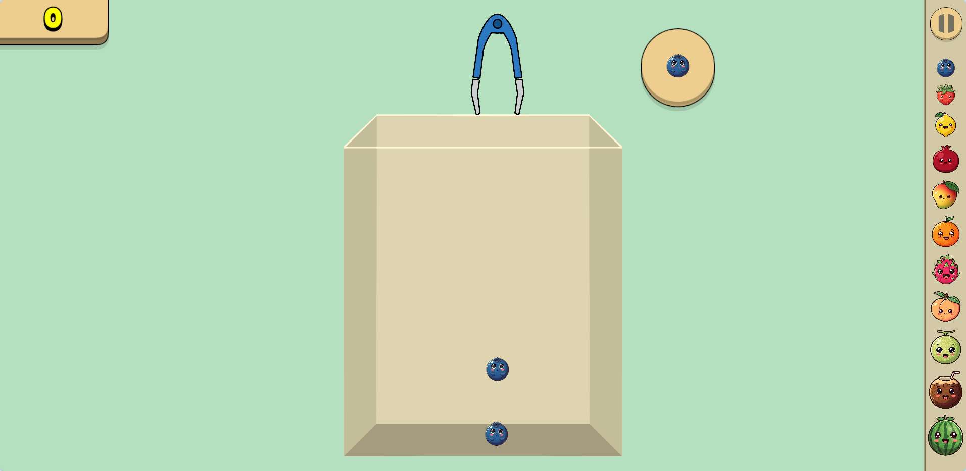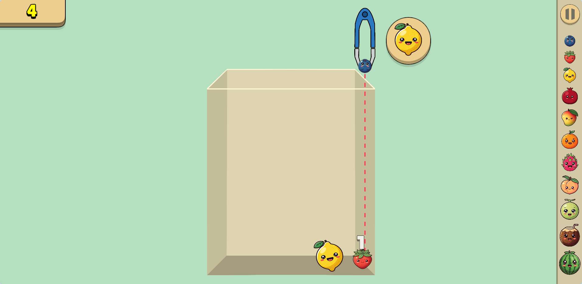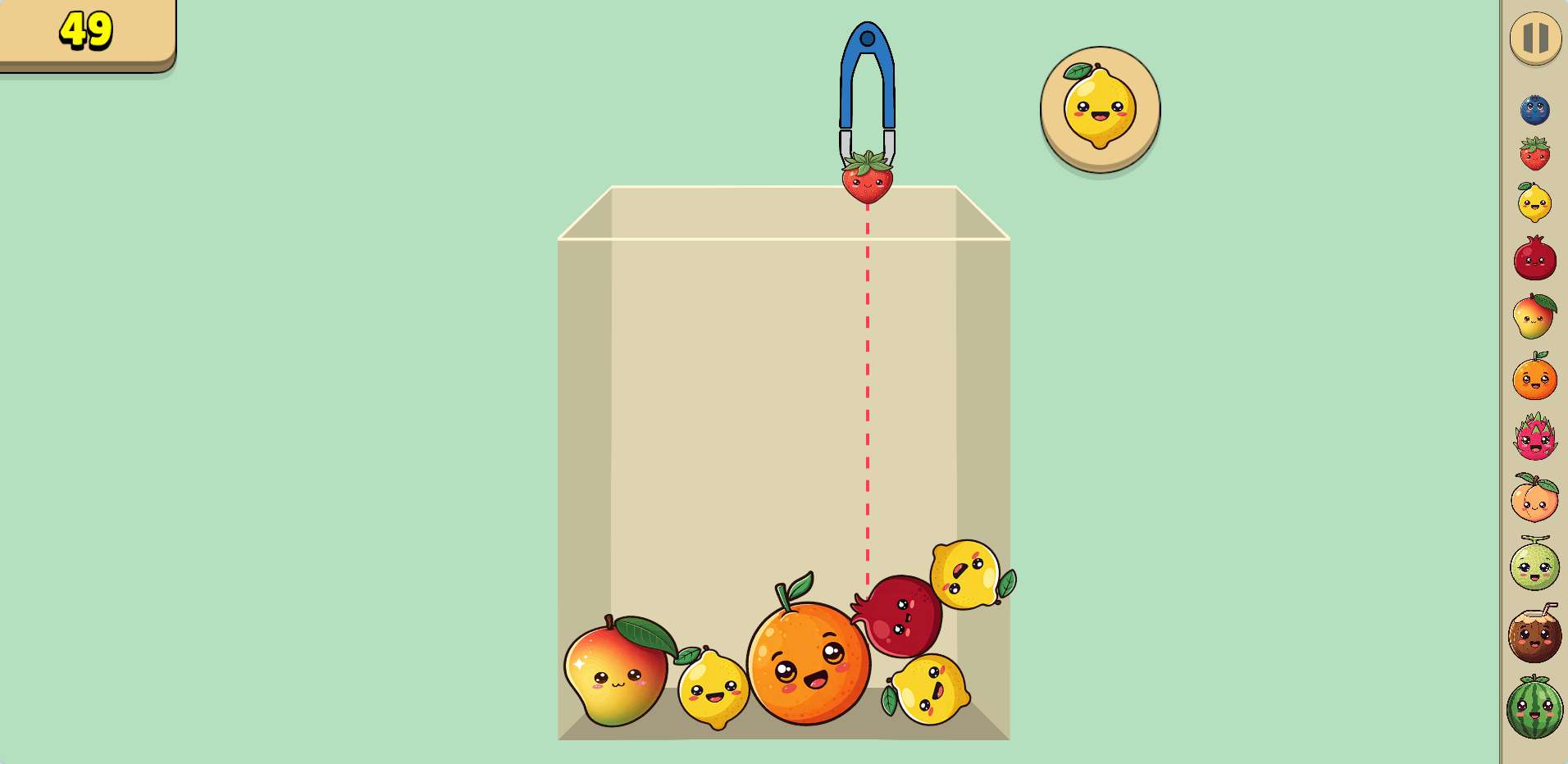 You don't control where the fruit lands after you drop it — physics does. That means you have to think about where the gap is, not just where you click. A fruit can bounce, roll, or settle in a spot you didn't expect.