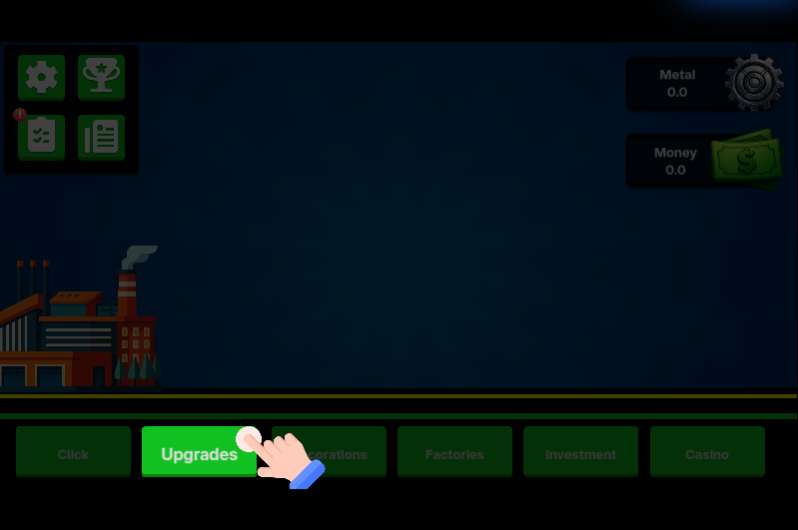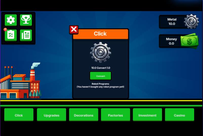 Idle Factory Game Tycoon wastes no time. You start with a single metal gear. Click it, produce metal, then immediately convert that metal into cash in the Click panel. That cash buys your first upgrades, which in turn unlock automated robots. Within minutes, you’ve set up a tiny, self-sustaining production line. The initial progression is swift and gratifying, giving you that essential early-game dopamine hit.