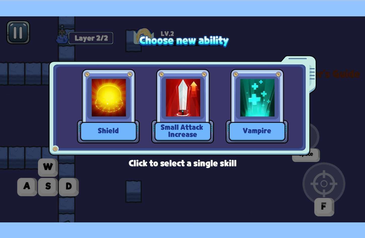 When upgrading, a skill selection interface appears, with options like "Shield", "Small Attack Increase", and "Vampire". Beginners are recommended to first choose "Small Attack Increase" to quickly boost damage output and make early combat easier; if you want to enhance survivability, "Shield" is a good choice as it can block damage at critical moments; "Vampire" suits players who prefer sustained combat, as it allows you to restore your own health when attacking enemies.