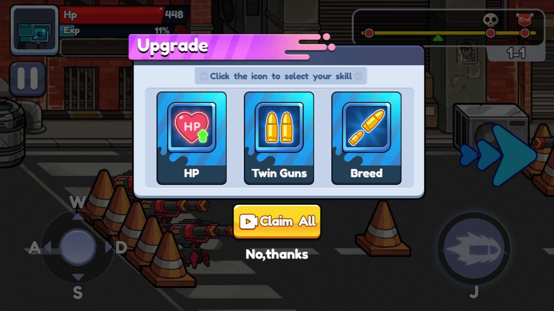 Progression Actions: Choose skills after leveling up to enhance weapon attributes such as damage and range.