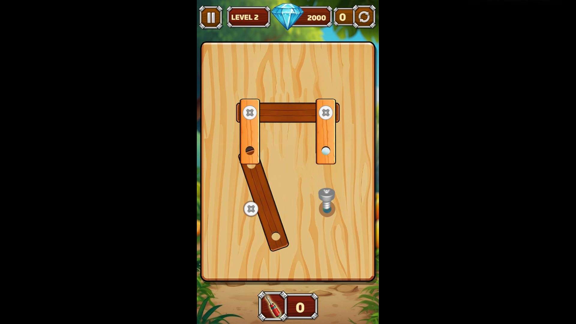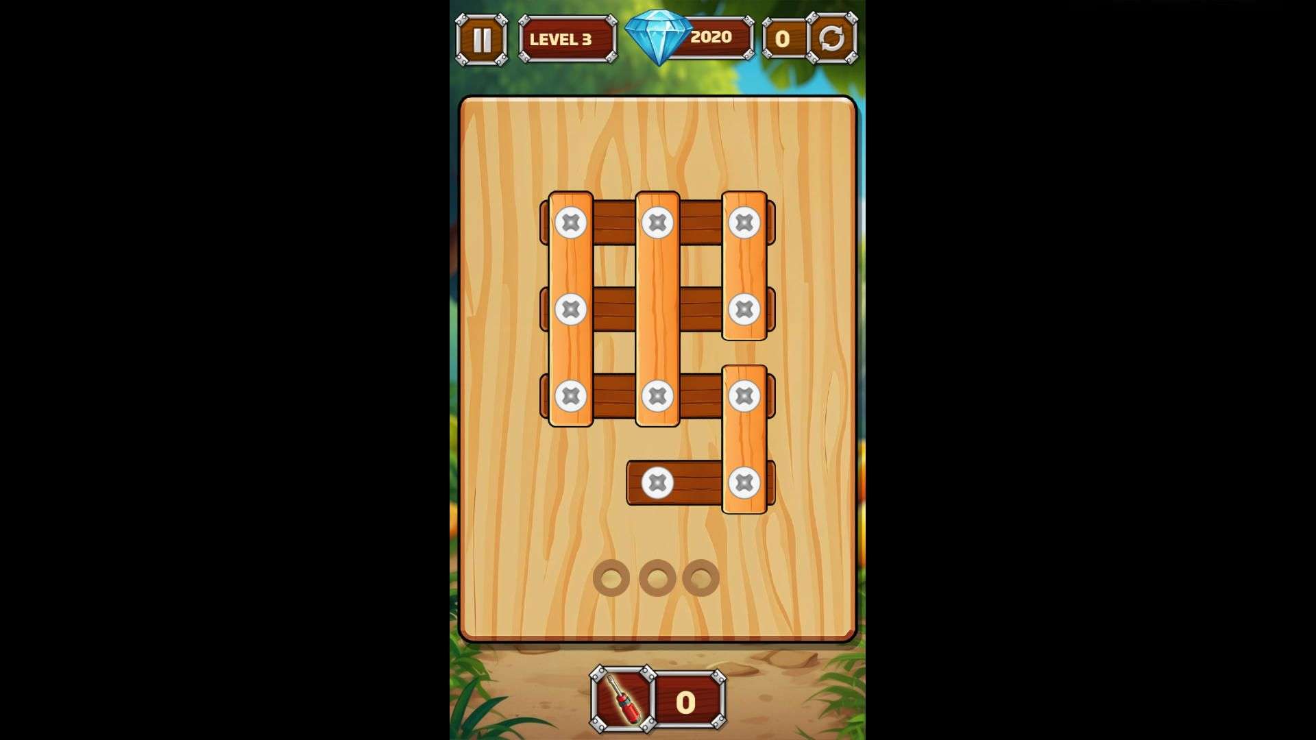 In Wood Screw, players must skillfully remove screws to make wooden plates fall and pass levels. Tap screws on the screen to unscrew and temporarily store them; they can fill empty slots if required. The top displays the level number, diamond count (for unlocking special items), plus a pause button (to pause anytime) and a reset button (to restart the level).