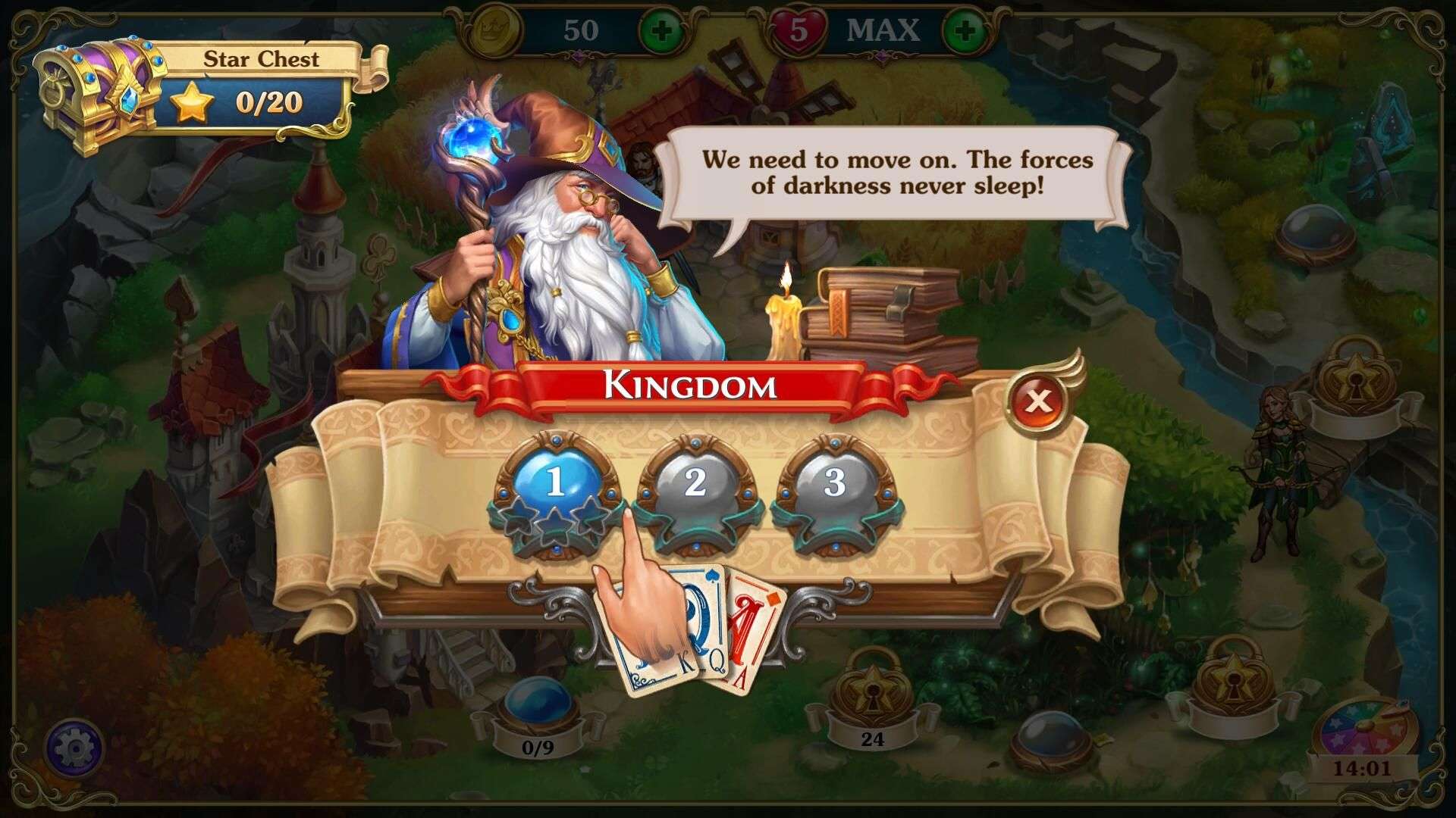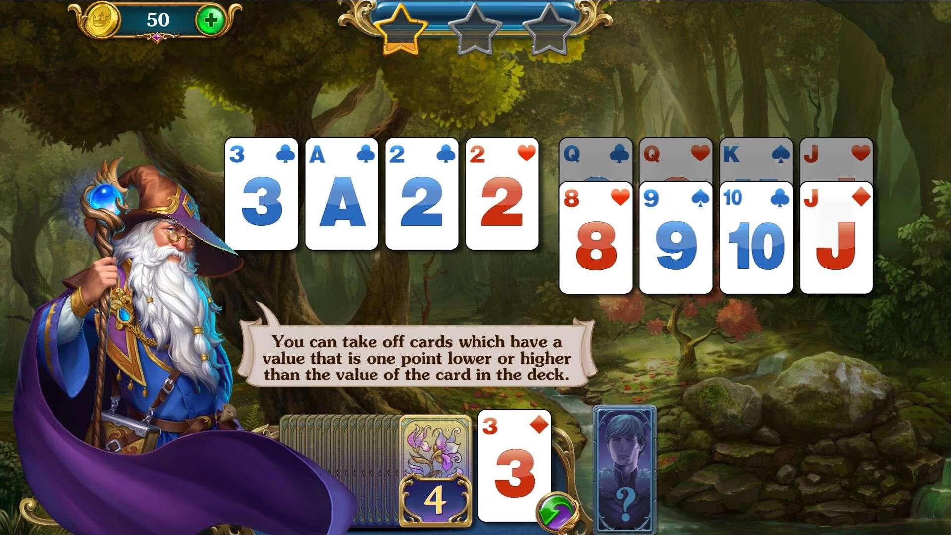 Strategically use the matching rule to clear all cards, complete each level's challenge, collect star rewards, and advance on your kingdom adventure.
