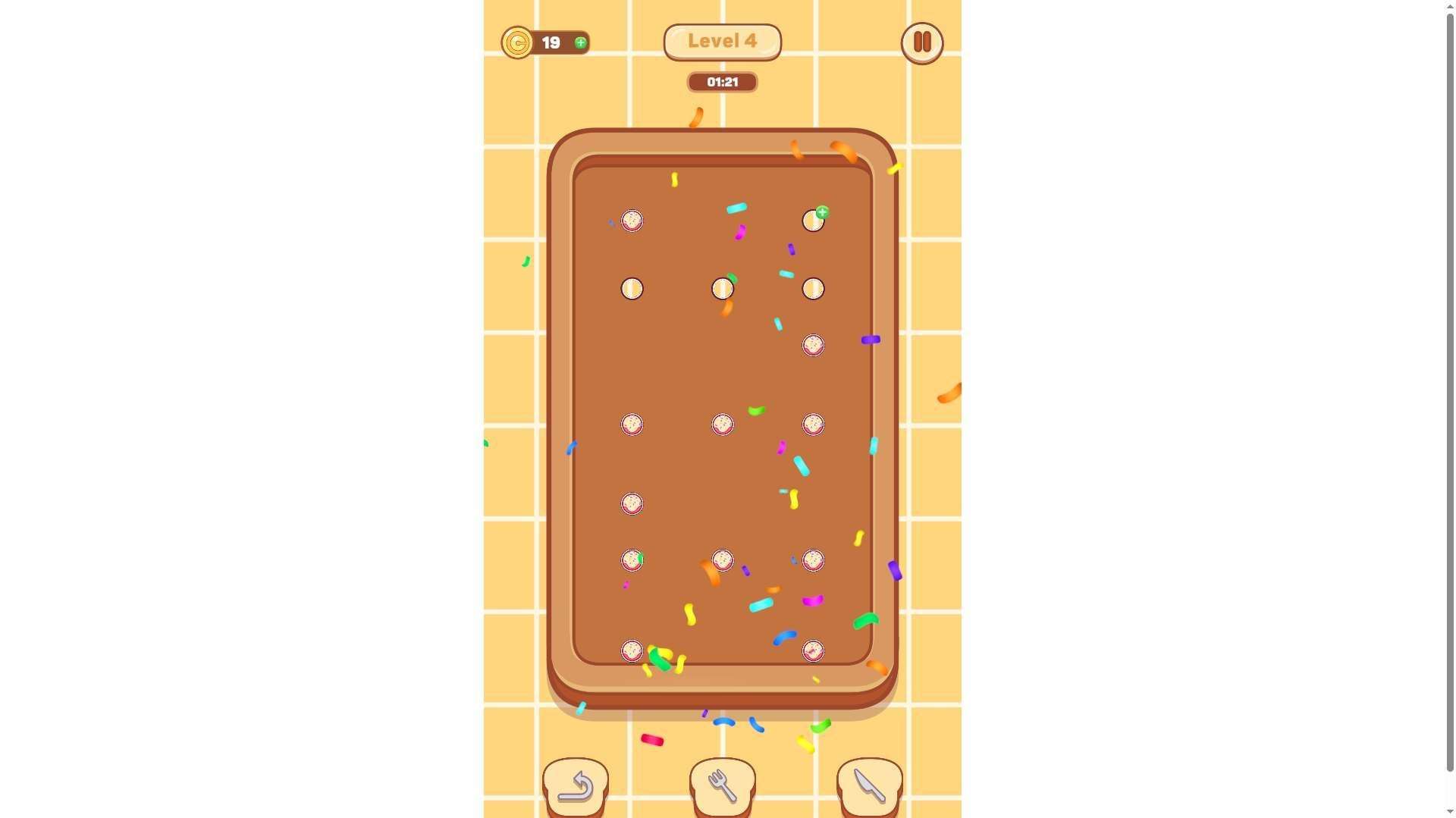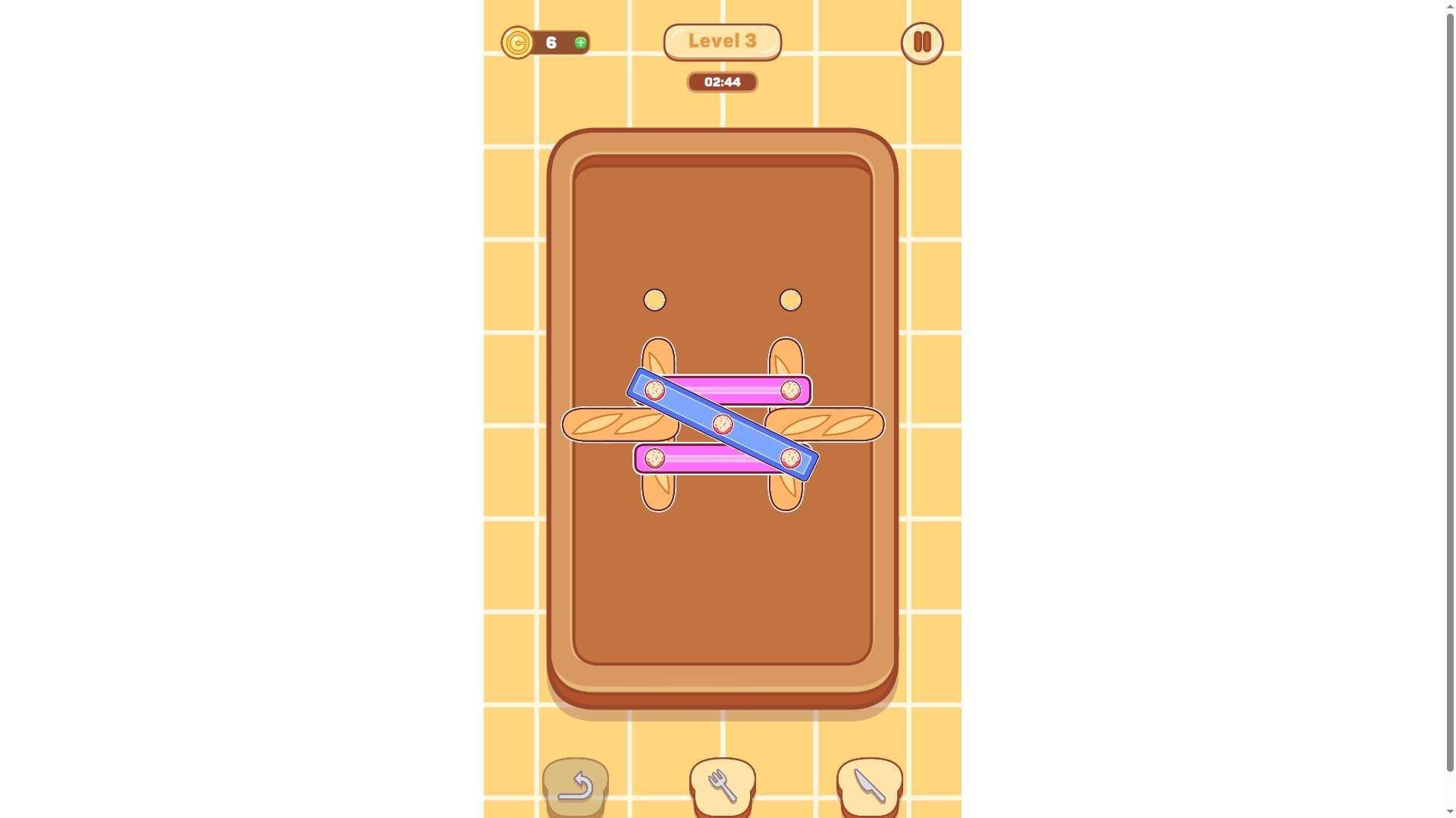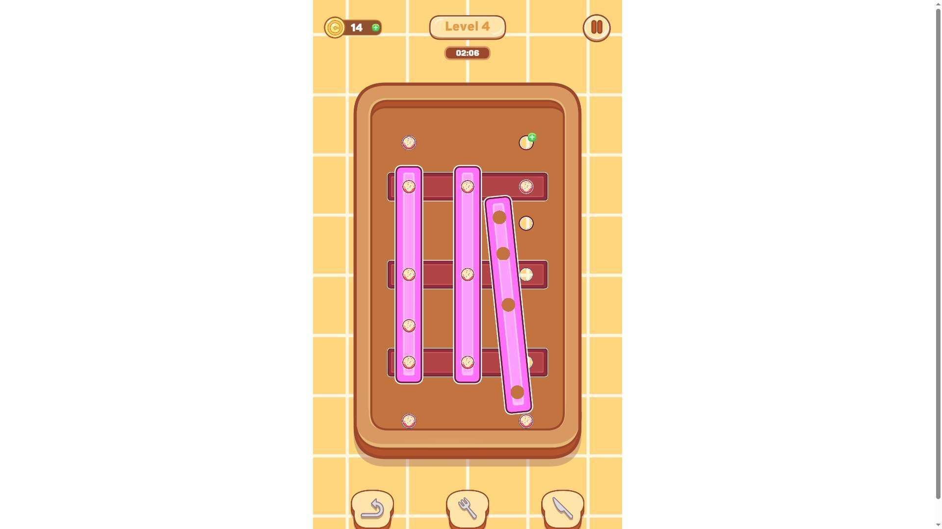 Unlock the corresponding holes by clicking or dragging the pins on the screen. Note that you must plan the operation sequence strategically — incorrect ordering may cause the chocolate bars to get stuck, so ensure they fall accurately into the target positions;