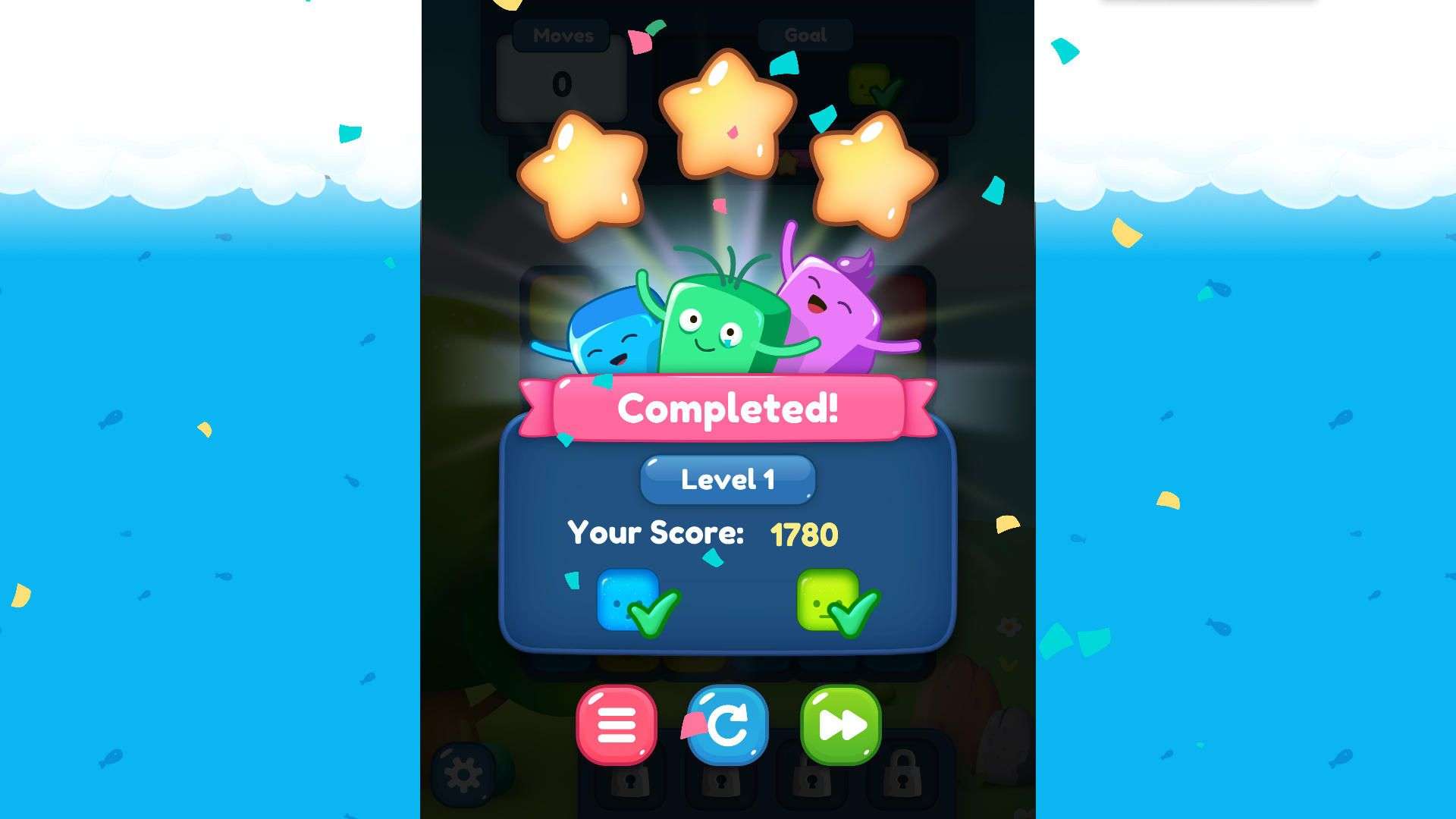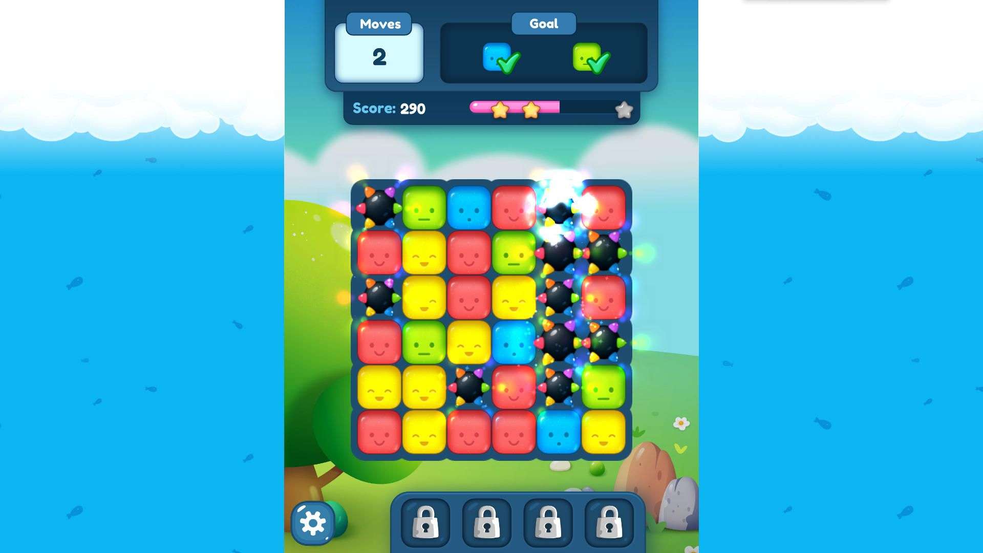 Each level has unique objectives, which are clearly displayed on the screen before the level starts. During the game, the panel at the top of the screen will also show the objectives continuously. Common objectives include: collecting specific types of candies (e.g., gathering a certain number of blue lollipops); breaking cookie tiles by eliminating matching candy combinations placed on top of them; and smashing the ice layers at the positions of matching candies in adjacent blocks. Only by completing these objectives can you smoothly progress to the next level.