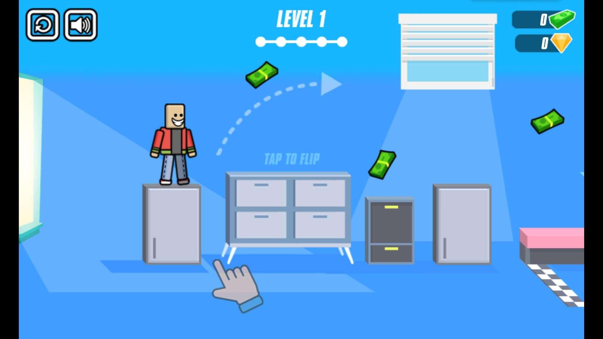 As you progress through the 20 well-crafted levels, the difficulty gradually increases, requiring more precise operation timing. When encountering dense obstacles (such as stacked furniture), use short taps to adjust your flip angle slightly, keeping the character close to the obstacle edges to avoid collisions. For high platforms, use a long press to flip upward, then a short tap mid-air to stabilize the character’s posture and land safely. Cash and diamonds are scattered throughout the levels—you don’t need extra operations to collect them; just let the character touch them while flipping, but prioritize avoiding the floor over collecting rewards to ensure level completion.