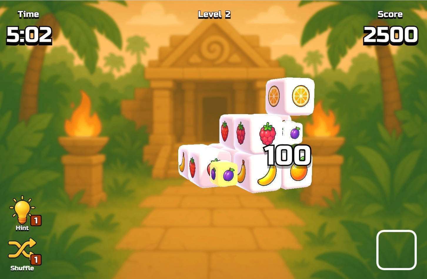 Tiles have bright fruit patterns; vivid visuals boost match recognition and create a cheerful vibe, fit for all ages.