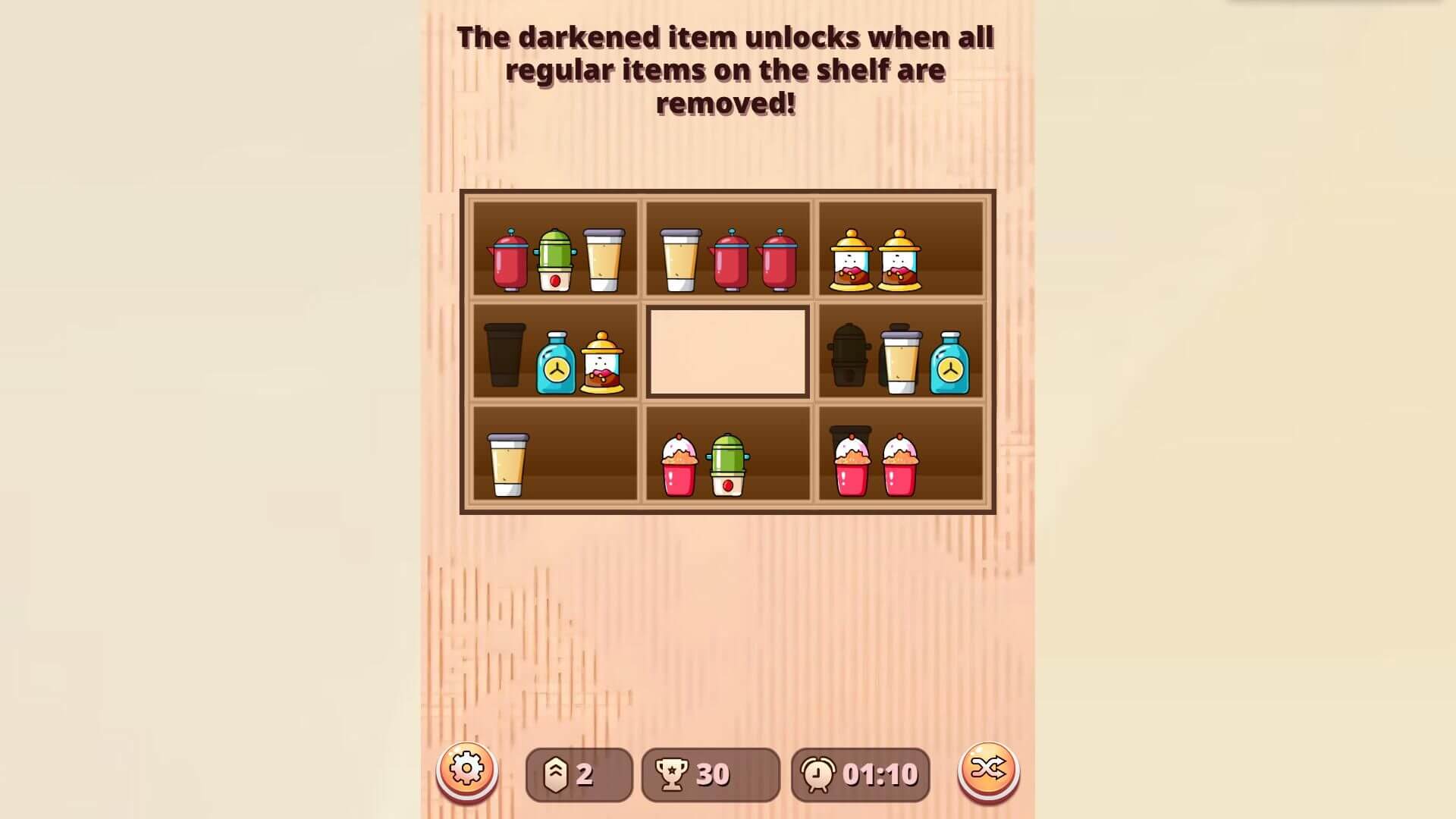 If you hit a dead end and run out of ideas, don’t panic. Tap the shuffle button, the items on the shelves will be mixed up and rearranged, and new matching opportunities may be hidden in this reorganized shelf space.