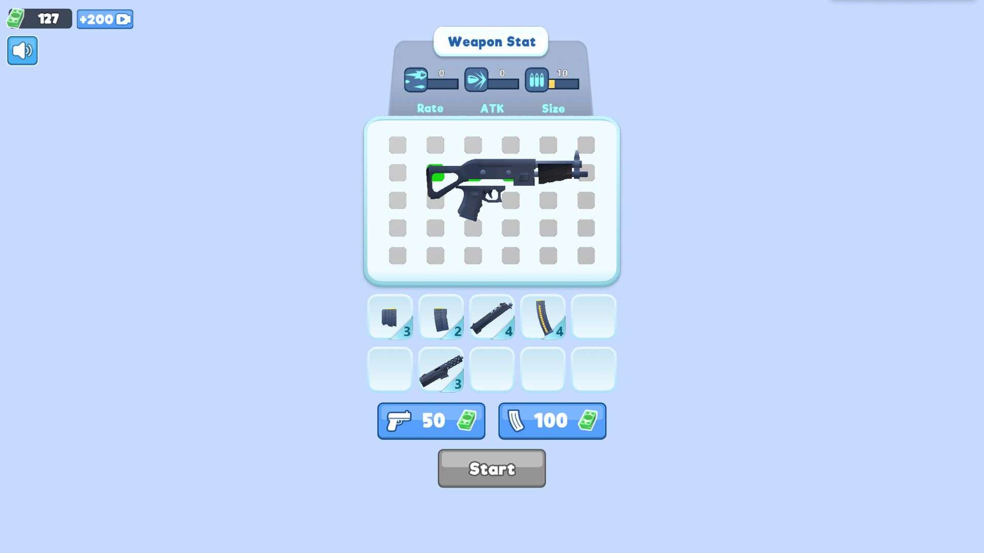 Purchase and Enhance: Spend currency to click on the options at the bottom to buy weapons and ammunition, then click "Start" to enter the battle.