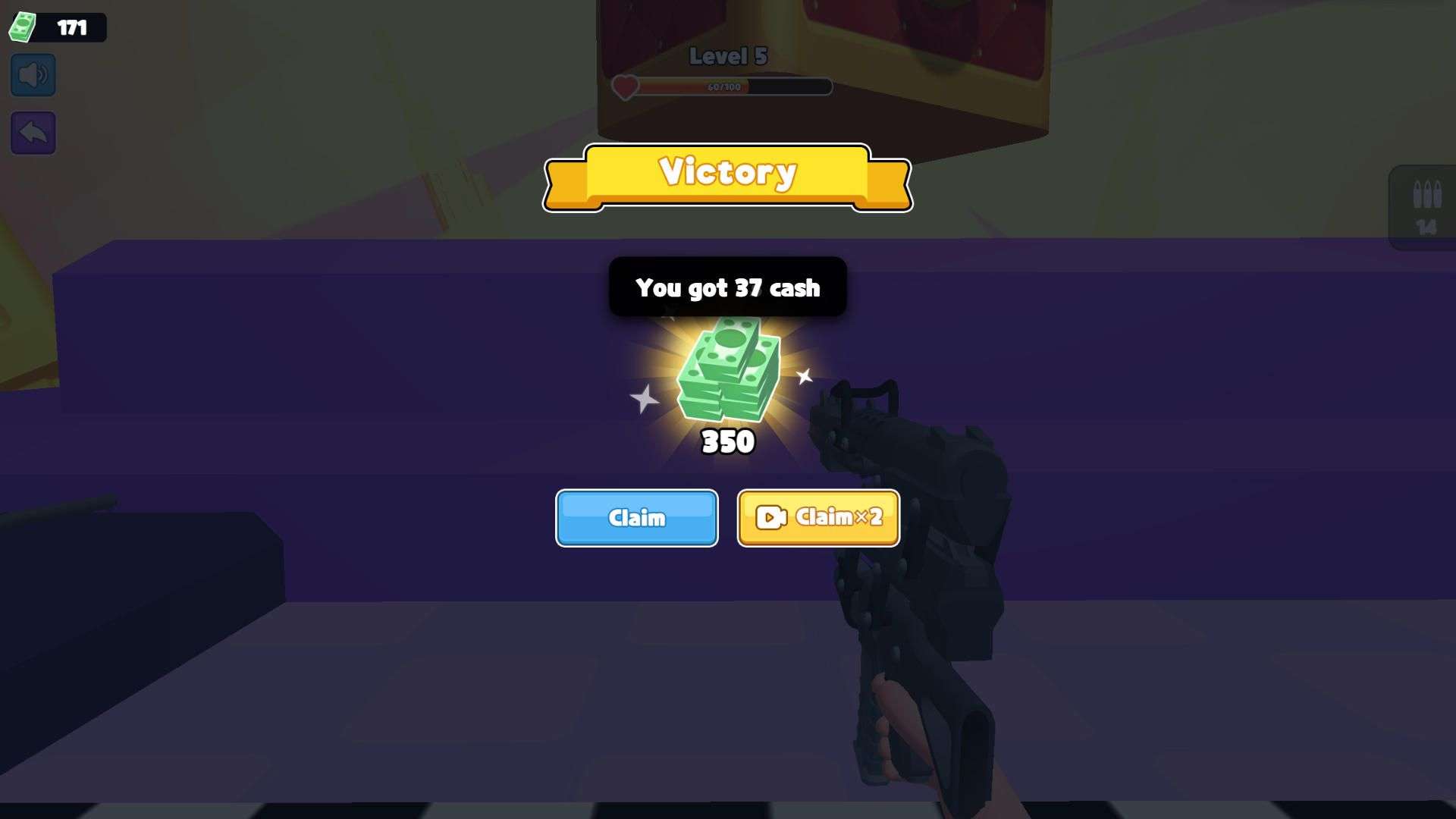 After successfully clearing a level, enter the “Victory” settlement interface to receive rewards like “37 Cash” and “350 Cash”. Click “Claim” to directly get the basic rewards and accumulate cash. If you want to quickly gather resources, choose “Claim×2” to watch an ad and get double rewards, accelerating weapon purchases and enhancements.