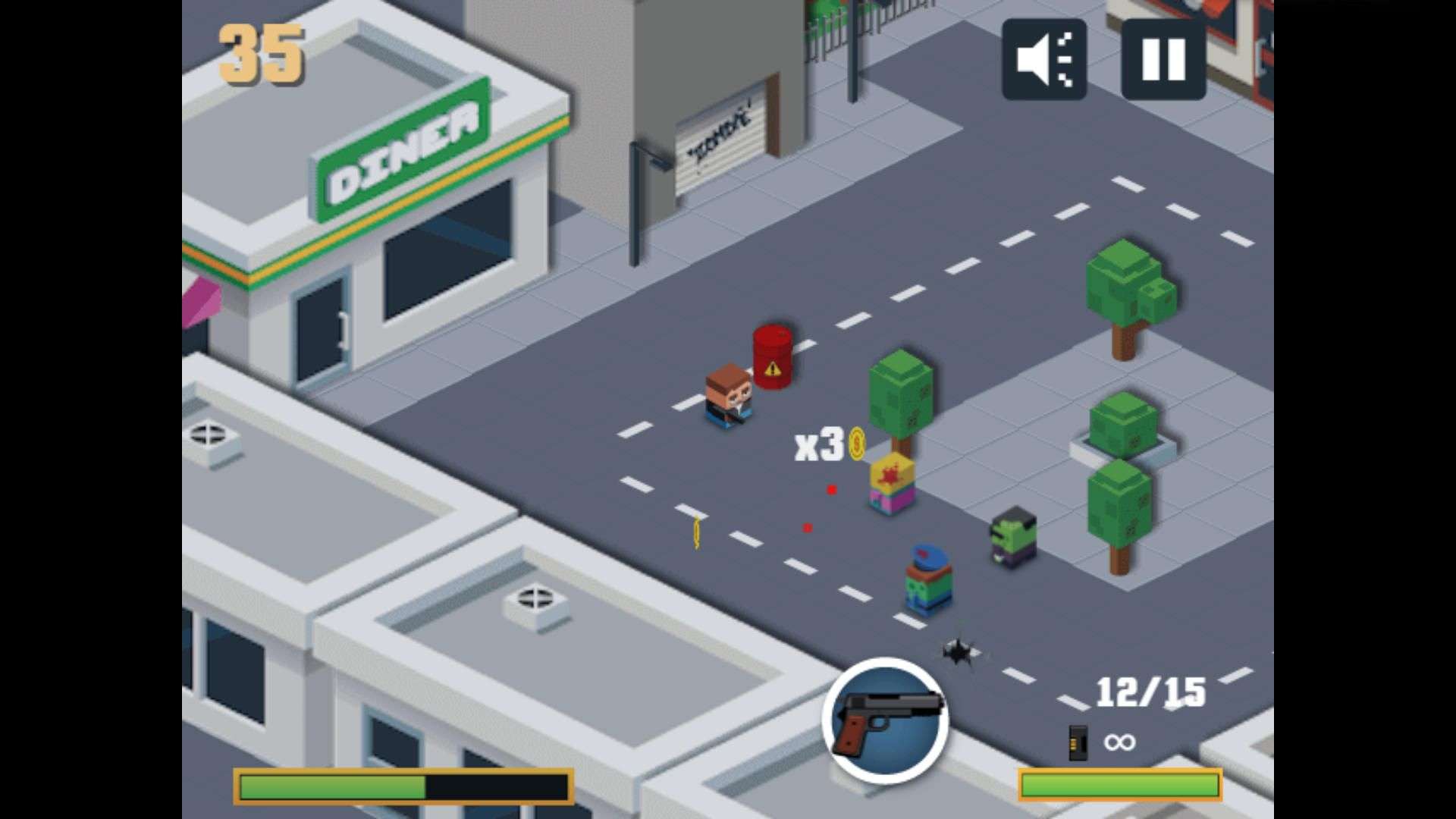 1. Make Good Use of Building Cover: Shops (such as the diner, the stores with red - and - white awnings) and trees on both sides of the street are natural shelters. When surrounded by zombies, quickly move behind buildings and use the walls to block zombie attacks. Clear the visible enemies one by one to avoid being attacked from multiple directions.